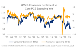 Many investors are currently weighing whether this employment weakness is a “soft patch” driven by transitory factors like tariffs or is instead something more systemic. With consumer spending accounting for 65-70% of U.S. GDP, consumer sentiment is key. One of the most puzzling disconnects this year has been between how people said they feel and how they actually spent. While there is normally a tight correlation between sentiment and spending, that relationship has diverged recently: