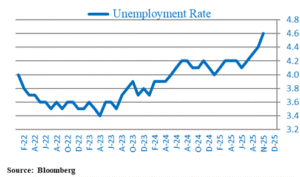 From a fundamental standpoint, the coming year looks promising. The Fed recently cut short-term interest rates for the third time this year, and more reductions appear likely. Furthermore, the stimulative aspects of the “One Big Beautiful Bill” have just begun to impact an economy that has worked through tariff-driven cost increases. This macroeconomic backdrop suggests accelerating growth in coming months. To my mind, the U.S. economy currently looks like a garden suffering from too little water, so the added stimulus may provide irrigation just when it’s needed most. Low-income consumers feel stretched and the job market has been wilting, as you can see below:
